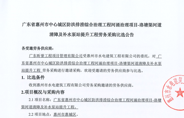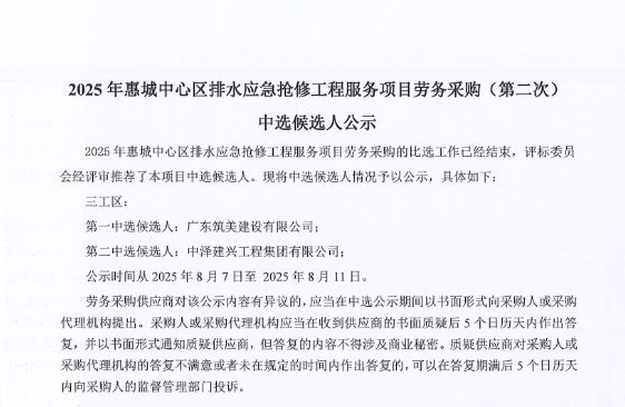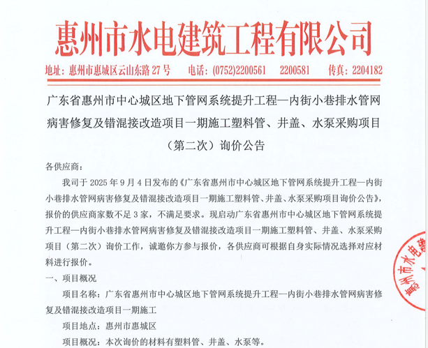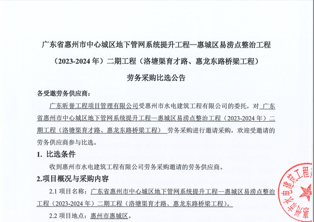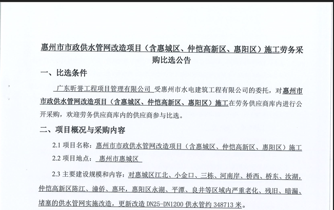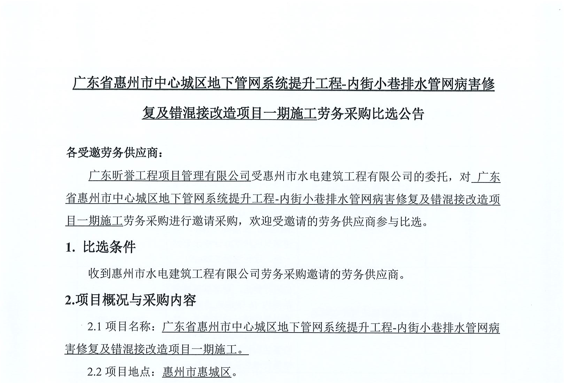 廣東省惠州市中心城區(qū)地下管網(wǎng)系統(tǒng)提升工程-內(nèi)街小巷排水管網(wǎng)病害修復(fù)及錯混接改造項(xiàng)目一期施工勞務(wù)采購比選公告……